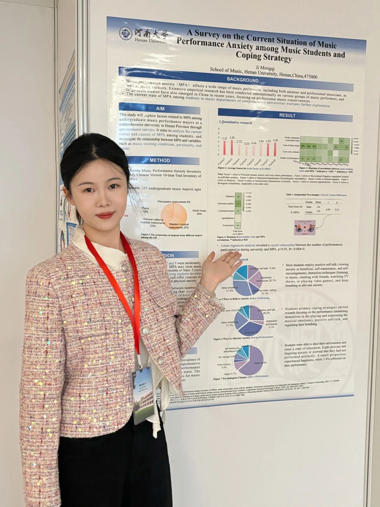 姬孟琪,性爱直播2024级艺术学硕士研究生(音乐教育学方向),在会议中报告的题目是《A Survey on the Current Situation of Music Performance Anxiety among Music Students and Coping Strategy》。旨在研究音乐专业大学生表演焦虑的现状与成因,分析音乐表演焦虑与音乐训练状况、人格、性别等变量之间的关系。对河南省某高校的245名音乐专业本科生的音乐表演焦虑现状展开问卷调查,测量工具采用Kenny音乐表演焦虑量表(K-MPAI)和中国版10项目大五人格量表(TIPI10)。描述性数据结果发现,大学生音乐表演焦虑的普遍性较高,其中K-MPAI量表第1、2、7、8维度得分较高,表明学生的音乐表演焦虑可能更多源于个人心理问题或恐惧。相关性分析结果表明,在音乐训练状况上,表演焦虑和学习音乐年限、大学期间参加表演次数显著性负相关;在人格上,表演焦虑和外向性(外向的、热情的)、尽责性(可靠的、自律的)、情绪稳定性(不易焦虑、冷静的)、开放性(乐于冒险、愿意接触新事物的)四个人格维度显著性负相关,与宜人性不存在显著相关。此外,研究还发现不同性别的表演焦虑差异性不大。该研究为音乐专业的表演实践和教育实践提供了启示和意见。