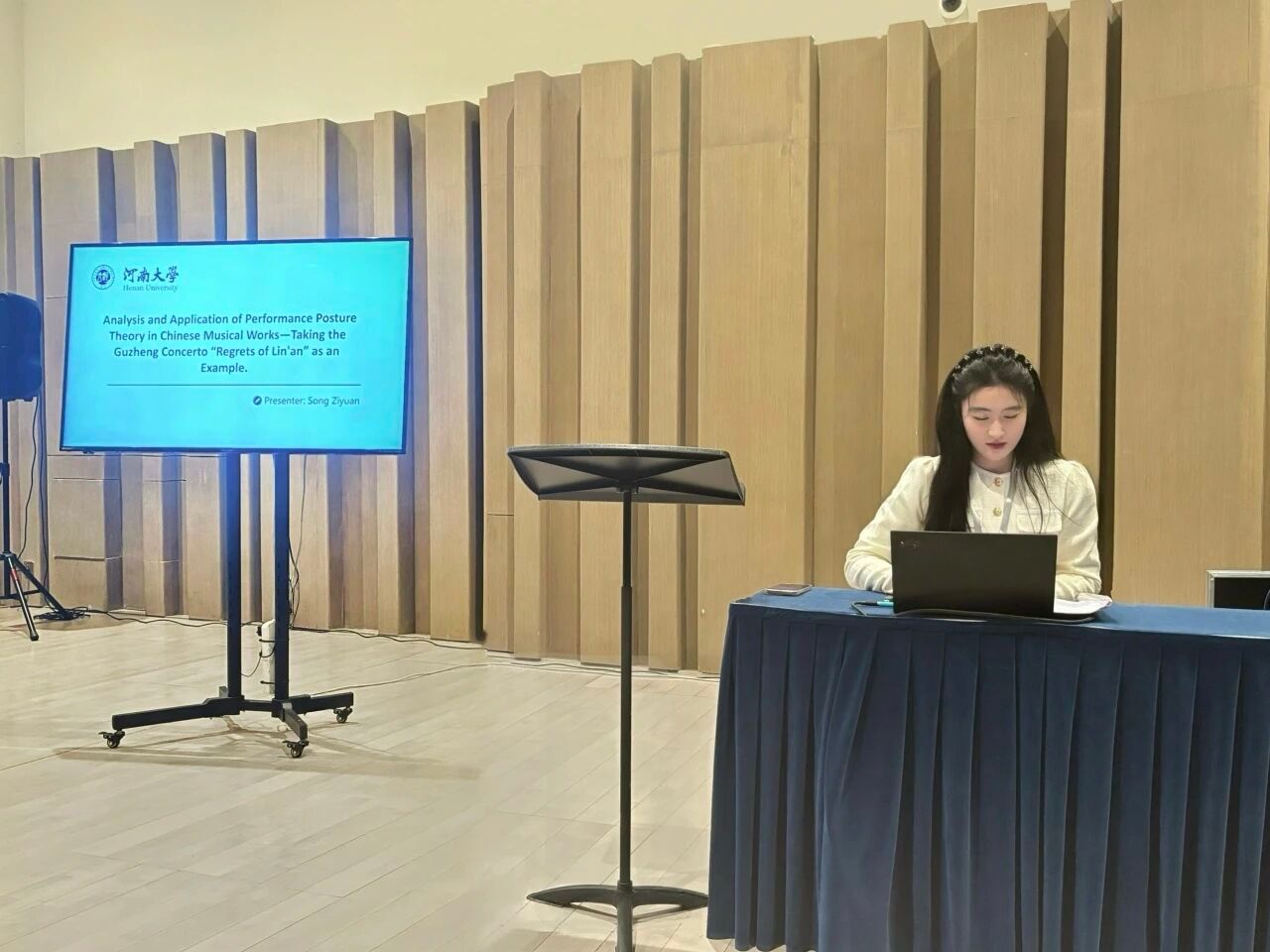 宋梓园,性爱直播2025级音乐专业硕士研究生(音乐教育方向)。在会议中报告的题目是《Analysis and Application of Performance Gesture Theory in Chinese Musical Compositions: An Example from the Guzheng Concerto ‘Lin'an Remains Hate》。研究使用音乐表演姿态理论对中国音乐作品古筝协奏曲《临安遗恨》中的一个片段进行了可视化分析,旨在解释音乐表演姿态理论中四种姿态(音响生成姿态、音响辅助姿态、演奏交流姿态、音响伴随姿态)在表演过程中的具体表现。通过图表分析法,详细阐述了器乐演奏家、歌剧表演家和舞蹈家三种不同专业四种姿态的异同;通过物理软件Tracker,测量表演者身体头部运动并进行数据分析,得出了影响音乐姿态的因素,主要是与演奏的速度、力度和情感有关。该研究对音乐表演者、聆听者和教育者提供启示:表演者可以通过对音乐表演姿态理论的分析研究,从中找到自己的演奏个性,使舞台表演更加饱满丰富;聆听者可以通过音乐表演姿态理论来对表演者肢体动作进行分析,更好地理解乐曲的感情;教育者可以合理运用音乐表演姿态理论进行更加科学的、创新的教育教学。