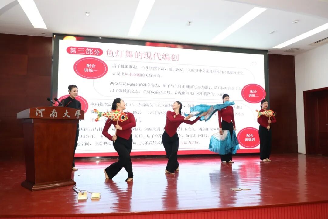 舞蹈编导专硕研究生贾溯宁、司雨、陈昱彤主讲的《鱼灯豫韵——河南传统民间舞蹈鱼灯舞的道具配合性训练》,以河南民间传说为背景,生动讲述鱼灯舞的起源与风格,巧妙融合扇子与鱼灯,感受发力逻辑与运动轨迹,赋予“水”与“游鱼”的意象表达。团队创新探索了道具手位与握法,结合传统阵型,强化道具间的联动配合,具象呈现“游鱼戏水”的灵动场景。