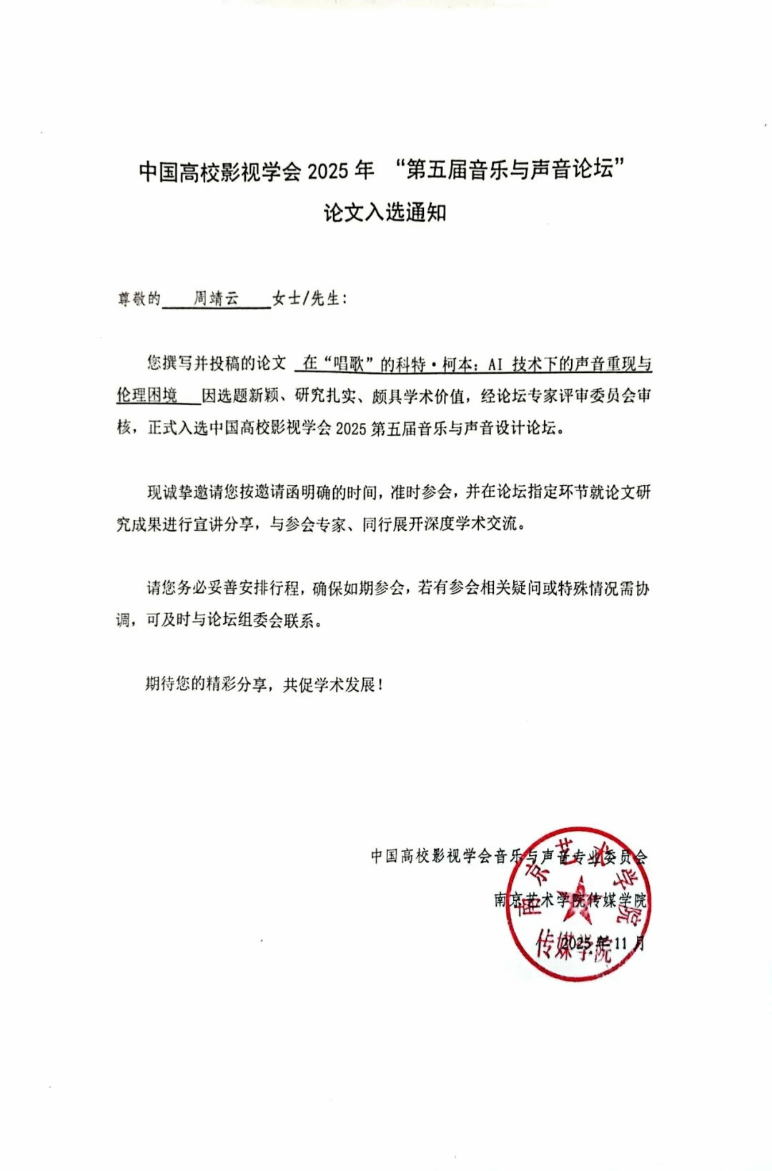 等73所院校及科研机构,参会总人数逾两百人,论坛投稿数总计123篇,创历届新高。性爱直播学术型研究生周靖云的论文成功入选本次会议(音乐与声音学术论坛五),并进行了现场宣讲。