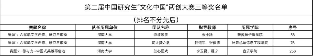 我校学子历经校赛、全国初赛层层筛选,最终3支队伍脱颖而出跻身全国总决赛,斩获全国三等奖3项,尽显河大学子在文化创新领域的扎实素养与责任担当。我校参赛队伍跨学科协同发力,在不同赛道绽放光彩,具体获奖名单如下(排名不分先后):