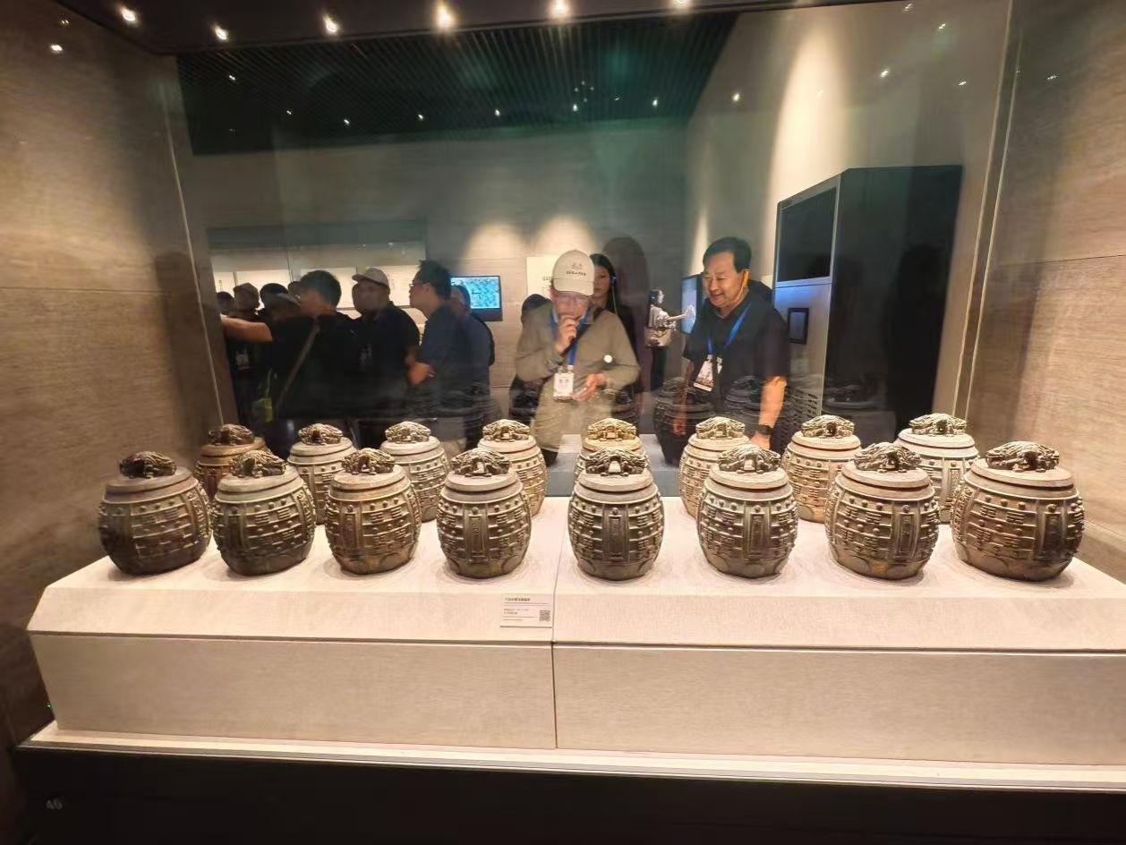 博物馆内,孔子讲学场景的群雕复原极具感染力,孔子广袖舒展的姿态与弟子们求知若渴的神情,直观呈现出礼乐教化的历史场景。郑国礼器坑的复原展示中,青铜鼎、壶等礼器的组合方式,印证了周代“列鼎而食”的礼乐等级制度。彩绘陶女俑的衣纹线条与姿态,与前一日祭孔大典佾舞的动作轨迹形成微妙呼应,表现出传统乐舞姿态的历史延续性。清代石编磬等文物的展出,为考察团提供了研究古代打击乐器形制与音色演变的实物依据。